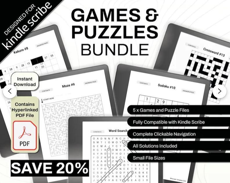 500 Puzzles in 5 individual files, specially designed for Kindle Scribe tablets to bring some joy and relaxation to your everyday life. This bundle gets you 20% off the files if purchased individually.